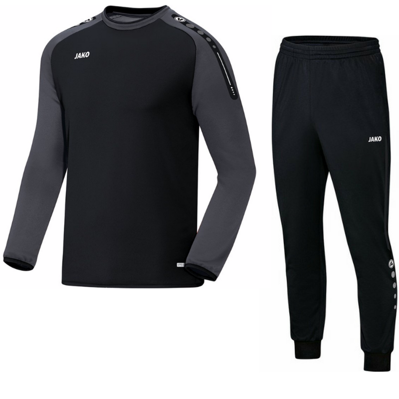 Koop hier het zwarte JAKO Champ sweat trainingspak. Dit pak bestaat uit een crew neck sweater en trainingsbroek. De crew neck sweater is zwart met grijze accenten en bevat een ronde hals in twee kleuren. Verder bevinden de trademark tekens van JAKO zich op de schouders en mouwen. De mouwen en de onderkant van de training top worden afgesloten door een elastisch boord. De mouwen bevatten bovendien een laser cut tape, de absolute eye-catcher van de Champ lijn! De trainingsbroek van dit pak is geheel zwarte met witte en grijze accenten en bevat aan de bovenkant een elastische boord met tunnelkoord. Hiermee kan de pasvorm aangepast worden. De onderkant van de broek bevat een ripp met een rits, zodat je deze broek makkelijk over je sneakers of sportschoenen aan en uit kan doen. De zijkanten van de broek bevatten twee zakken met een rits en op deze broek staan natuurlijk ook de trademark tekens van JAKO, evenals het logo. Dit is het perfecte trainingspak om met je (zaal)voetbalelftal of bedrijf in te voetballen/trainen of andere sporten in te beoefenenen.
