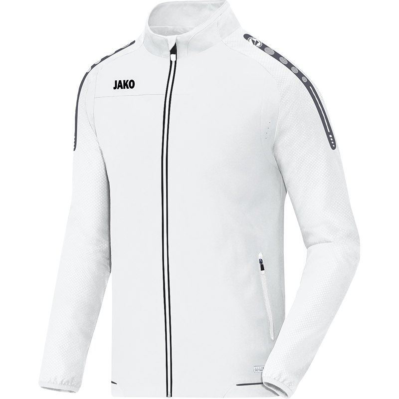 Koop hier het witte JAKO Champ vrijetijds trainingsjack. Dit is het ideale jack om voor of na het sporten te dragen. Het jack is geheel wit en bevat aan de zijkanten twee zakken met ritsen. Verder wordt dit JAKO trainingsjack gekenmerkt door de hoge hals met een doorlopende rits in twee kleuren. Over de schouders en mouwen bevinden zich de trademark tekens van JAKO en op de rechter borst prijkt het logo van het merk. Dit jack is uitgerust met ventilatie-openingen voor de optimale verkoeling. Daarnaast hebben de mouwen een relief design en zijn deze uitgerust met een bevatten bovendien een laser cut tape, de absolute eye-catcher van de Champ lijn! De mouwen worden afgesloten door een elastische binding en het jack bevat een mesh binnenvoering, voor het optimale gevoel.