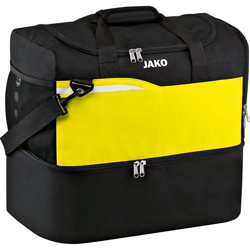 Koop hier de Jako Competition tas in het zwart/geel voor volwassenen. Deze tas is perfect te gebruiken voor bij het sporten of als je veel spullen mee moet nemen. De tas kenmerkt zich aan de grote vakken en het kleine binnenvakje met rits in het hoofdvak. Verder heeft de tas een afneembare schouderriem en prijkt het Jako logo op de tas.