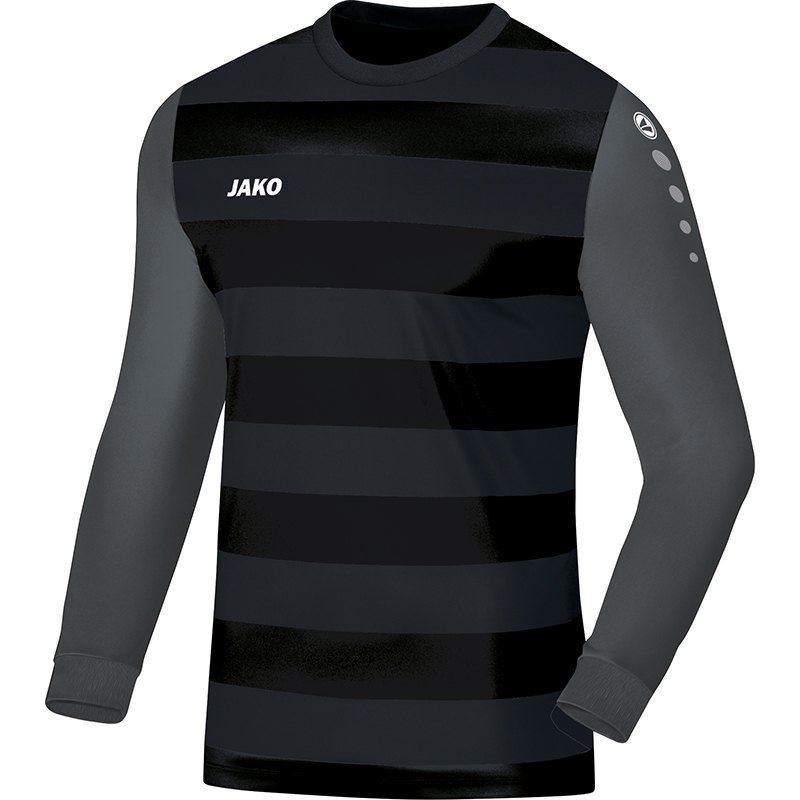 Koop hier het zwarte Robey keepersshirt met lange mouwen en met padding (bescherming). Dit polyester goalkeepersshirt is geheel zwart en bevat een ronde hals met ripp. Een stijlvol keepershirt. Ook bij katachtige reddingen blijft het shirt goed zitten. Op de rechter borst prijkt het logo van JAKO en de mouwen zijn uitgerust met de trademark tekens van het Duitse sportmerk. Op de voorkant van het shirt bevinden zich bovendien horizontale strepen. Dit is het ideale shirt om met je (zaal)voetbalelftal of bedrijf in te voetballen of andere sporten in te beoefenen zoals handbal en volleybal. Dit shirt bestaat voor 100% uit polyester en is uitgerust met de JAKO Keep Cool technologie. Deze technologie zorgt voor verkoeling, ventilatie en vochtafvoer, zodat je optimaal kan presteren in dit shirt.