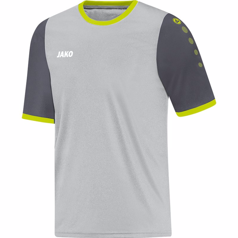 Koop hier het grijze JAKO LEEDS TEAMWEAR shirt. Dit voetbalshirt is grijs en bevat een ronde hals in een lime kleur. Ook de bies aan de onderkant van de mouwen is in een lime kleur. De mouwen hebben een iets donkerdere tint grijs. Op de rechter borst prijkt het logo van JAKO en de mouwen zijn uitgerust met de trademark tekens van het Duitse sportmerk. Dit is het ideale shirt om met je (zaal)voetbalelftal of bedrijf in te voetballen of andere sporten in te beoefenen zoals handbal en volleybal. Dit shirt bestaat voor 100% uit polyester en is uitgerust met de JAKO Keep Cool technologie. Deze technologie zorgt voor verkoeling, ventilatie en vochtafvoer, zodat je optimaal kan presteren in dit shirt.