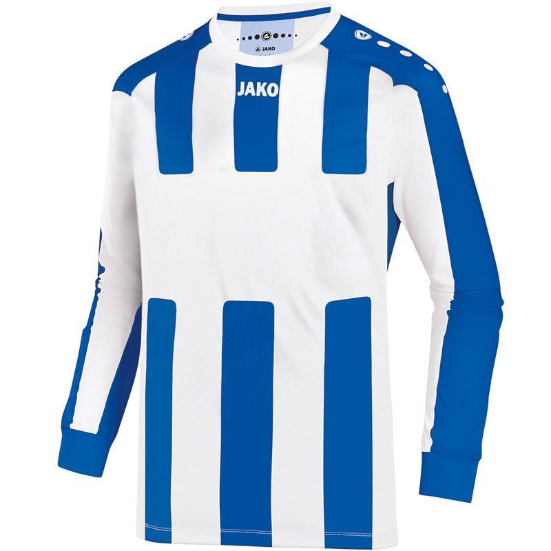 Koop hier het blauw/wit gestreepte JAKO Milan teamwear shirt met lange mouwen voor kinderen. Dit shirt wordt gekenmerkt door de blauwe en witte verticale banen over het shirt. Verder bevat dit sport shirt ronde hals. Op het midden bevindt zich een horizontaal wit vlak, waarin een (sponsor)logo bedrukt kan worden. Verder bevatten de mouwen een speciale strip. Hierin zijn de trademark tekens van JAKO verwerkt. Het logo van JAKO prijkt op het midden van de borst. Ook de achterkant van het shirt bevat blauwe en witte banen. Dit is het perfecte shirt om met jouw voetbalelftal, zaalvoetbalelftal of jouw bedrijf mee te voetballen of in te trainen. Dit shirt voor kinderen bestaat voor 100% uit polyester en is uitgerust met de JAKO Keep Cool technologie. Deze technologie zorgt voor verkoeling, ventilatie en vochtafvoer, zodat je optimaal kan presteren in dit shirt.