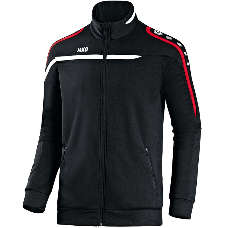 Koop hier het zwarte JAKO Performance trainingsjack. De Teamline PERFORMANCE heeft een dynamische en sportieve uitstraling door de ultieme combinatie van asymmetrisch design, subtiel contrasterende inzetstukken en opvallende JAKO-dots.Dit is het perfecte trainingsjack om in te trainen of sporten. Het jack is geheel zwart en bevat aan de zijkanten twee zakken met ritsen. Verder wordt dit JAKO trainingsjack gekenmerkt door de hoge hals met een doorlopende rits. Over de schouders en mouwen bevinden zich de trademark tekens van JAKO en op de rechter borst prijkt het logo van het merk. De mouwen en de onderkant van het jack worden afgesloten door een ripp boord. De mouwen bevatten bovendien twee strepen en de borst bevat ook een horizontale band.
