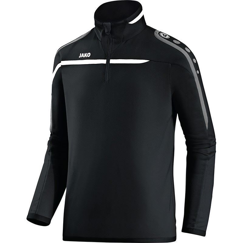 Koop hier de zwarte JAKO Performance training top voor kinderen. De Performance trainingslijn heeft een dynamische en sportieve uitstraling door de ultieme combinatie van assymetrisch design, subtiel contrasterende inzetstukken en opvallende JAKO dots. Deze training top bevat een rits tot de borst en ter hoogte van de rechter borst bevindt zich het logo van JAKO. Verder bevinden de trademark tekens van JAKO zich op de schouders en mouwen. Op de borst staat bovendien een horizontale lijn en de mouwen bevatten ook twee lijnen. De mouwen en de onderkant van de training worden afgesloten door een elastisch boord. De rits bevat aan de bovenkant een zipper garage, waarin je de rits kan verstoppen. Dit is de perfecte training top om met je (zaal)voetbalelftal of bedrijf in te voetballen of andere sporten in te beoefenenen.