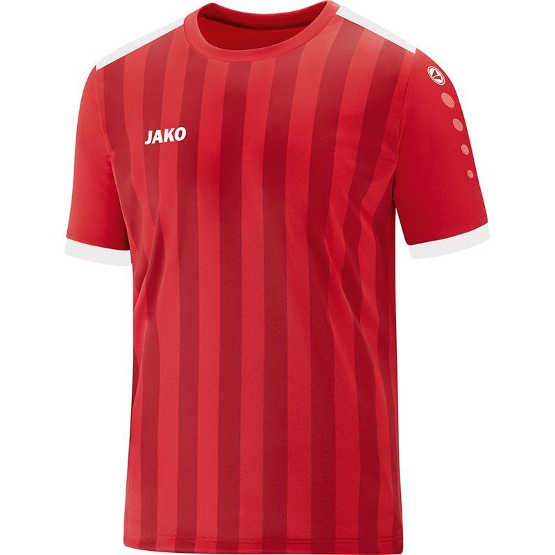 Koop hier het rode JAKO Porto 2.0 TEAMWEAR shirt voor kinderen. Dit polyester shirt is geheel rood en wordt gekenmerkt door Jako trademark tekens over beide mouwen. Verder bevat dit sportshirt een ronde hals en zijn de schouders uitgerust met een witte strip. De bies aan de onderkant van de mouwen is ook wit. De rechter borst bevat het logo van JAKO. Over de voorkant zijn verticale schaduwstrepen aangebracht. Dit is het ideale shirt om met je (zaal)voetbalelftal of bedrijf in te voetballen of andere sporten in te beoefenen zoals handbal en volleybal.