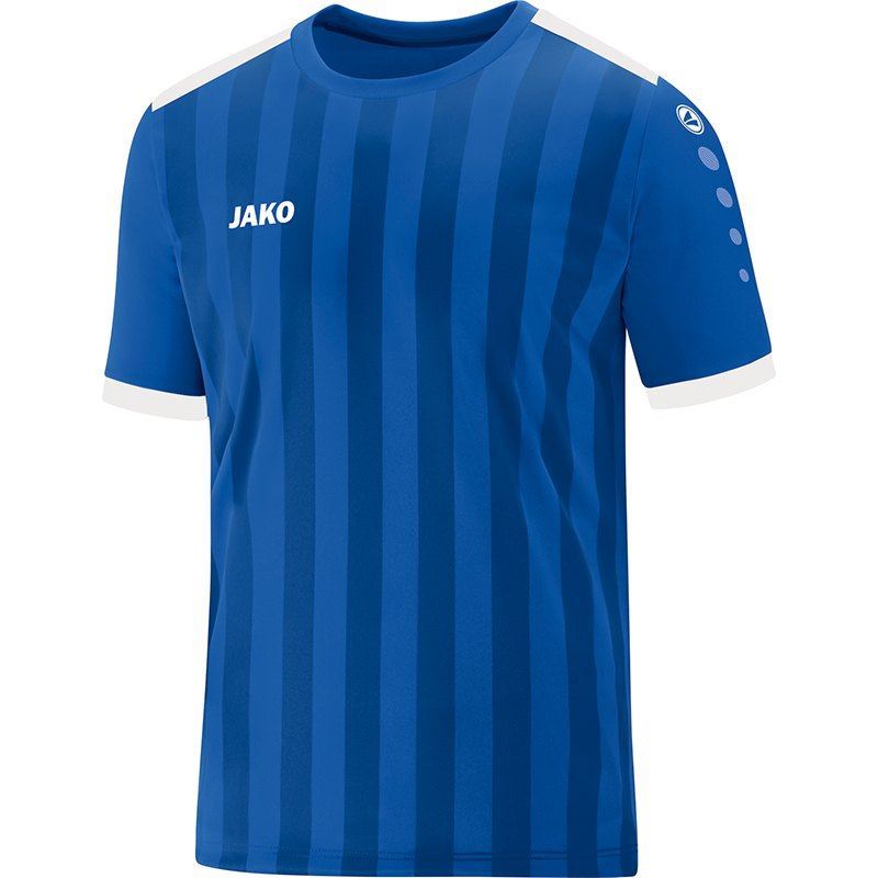 Koop hier het blauwe JAKO Porto 2.0 TEAMWEAR shirt voor kinderen. Dit polyester shirt is geheel blauw en wordt gekenmerkt door Jako trademark tekens over beide mouwen. Verder bevat dit sportshirt een ronde hals en zijn de schouders uitgerust met een witte strip. De bies aan de onderkant van de mouwen is ook wit. De rechter borst bevat het logo van JAKO. Over de voorkant zijn verticale schaduwstrepen aangebracht. Dit is het ideale shirt om met je (zaal)voetbalelftal of bedrijf in te voetballen of andere sporten in te beoefenen zoals handbal en volleybal.