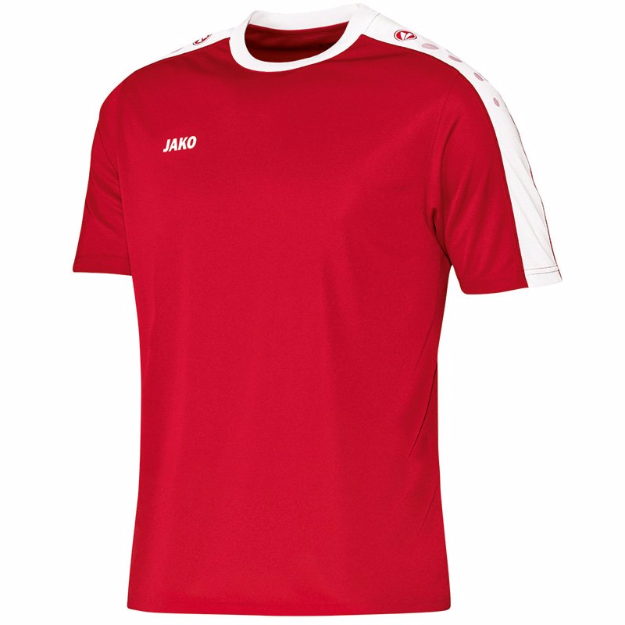 Koop hier het rode JAKO Stiker TEAMWEAR shirt. Dit voetbalshirt is rood en bevat een ronde hals in het wit. Ook de brede strip over de mouwen van dit teamkleding shirt is wit. Op de rechter borst prijkt het logo van JAKO en de mouwen zijn uitgerust met de trademark tekens van het Duitse sportmerk. Dit is het ideale shirt om met je (zaal)voetbalelftal of bedrijf in te voetballen of andere sporten in te beoefenen zoals handbal en volleybal. Dit shirt bestaat voor 100% uit polyester en is uitgerust met de JAKO Keep Cool technologie. Deze technologie zorgt voor verkoeling, ventilatie en vochtafvoer, zodat je optimaal kan presteren in dit shirt.