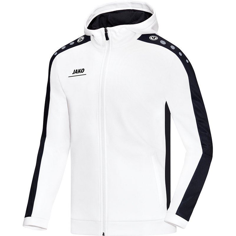 Koop hier het wit/zwarte JAKO Striker trainingsjack met capuchon. Dit jack doet zijn naam eer aan en is de perfecte top om aan te vallen en je in de kijker te spelen. Dit is het perfecte trainingsjack om in te trainen of sporten, maar ook om casual te dragen voor of na het sporten. Het jack is geheel wit/zwart en bevat aan de zijkanten twee zakken met ritsen. Bovendien bevat het jack een capuchon, waarin je je heerlijk kan verstoppen. Verder wordt dit JAKO trainingsjack gekenmerkt door de hoge hals met een doorlopende rits. De mouwen bevatten de trademark tekens van JAKO en op de rechter borst prijkt het logo van het merk. De mouwen bevatten bovendien een contrasterende strip met sublimatieprint. Dit beklemtoont de sportieve look van de Striker lijn. De binnenkant van het jack is uitgerust met een zachte fleecevoering, voor het perfecte gevoel.