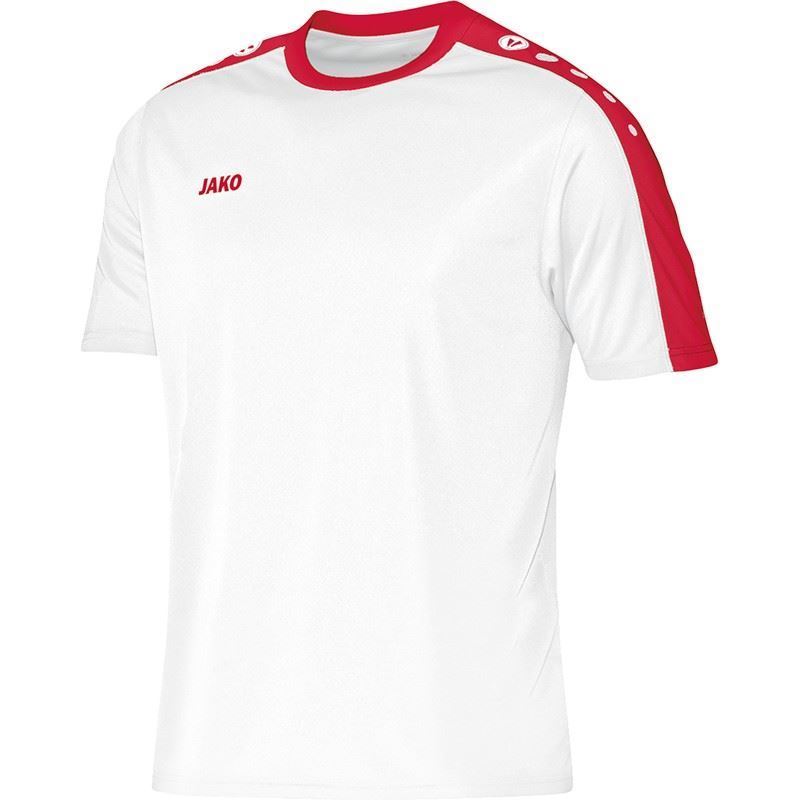 Koop hier het wit/rode JAKO Stiker TEAMWEAR shirt voor kinderen. Dit kids voetbalshirt is wit en bevat een ronde hals in het rood. Ook de brede strip over de mouwen van dit teamkleding shirt is rood. Op de rechter borst prijkt het logo van JAKO en de mouwen zijn uitgerust met de trademark tekens van het Duitse sportmerk. Dit is het ideale shirt om met je (zaal)voetbalelftal of bedrijf in te voetballen of andere sporten in te beoefenen zoals handbal en volleybal. Dit kids shirt bestaat voor 100% uit polyester en is uitgerust met de JAKO Keep Cool technologie. Deze technologie zorgt voor verkoeling, ventilatie en vochtafvoer, zodat je optimaal kan presteren in dit shirt.