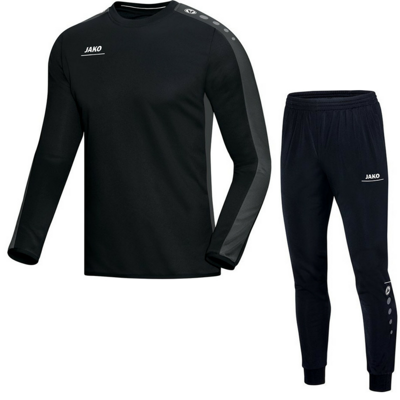 Koop hier het zwarte JAKO Striker sweat trainingspak voor kinderen. Dit pak bestaat uit een crew neck sweater en trainingsbroek. Deze crew neck sweater bevat een ronde hals met ripp. De mouwen bevatten bovendien een contrasterende strip met sublimatieprint. Dit beklemtoont de sportieve look van de Striker lijn. Verder bevinden de trademark tekens van JAKO zich op de schouders en mouwen. De mouwen en de onderkant van de training top worden afgesloten door een elastisch boord. Dit is de perfecte training top om met je (zaal)voetbalelftal of bedrijf in te voetballen, te trainen of andere sporten in te beoefenenen. De trainingsbroek van dit pak is geheel zwart met witte accenten. Dit is de perfecte trainingsbroek om in te trainen. Deze trainingsbroek heeft een toelopende pasvorm, wat ervoor zorgt dat deze vooral strak om de kuiten en enkels valt. De zijkanten van de trainingsbroek bevatten zakken en verder is de bovenkant van de trainingsbroek uitgerust met een elastische tailleband, waarmee de pasvorm versteld kan worden. De onderkant van de pijpen bevatten een ripp en handige enkelritsen, waardoor je de broek makkelijk over je schoenen en sneakers aan en uit kan doen. Uiteraard mogen het JAKO logo en trademark tekens niet ontbreken.