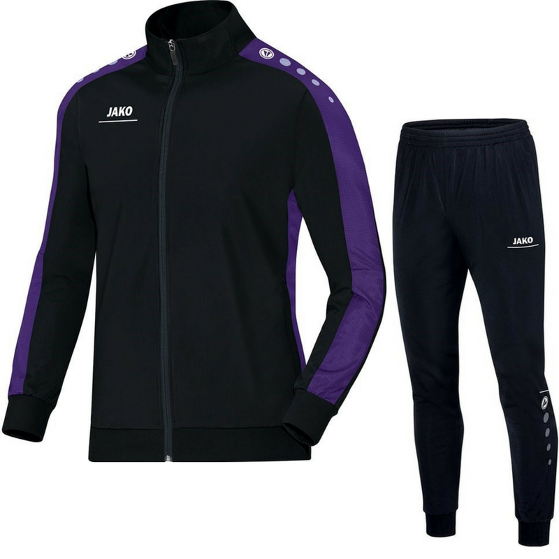 Koop hier het zwarte/paarse JAKO Striker trainingspak. Dit is het perfecte trainingspak om tijdens, voor of na het sporten te dragen. Het is namelijk zowel een functioneel als een casual pak. Het jack is geheel zwart/paars en bevat aan de zijkanten twee zakken met ritsen. Verder wordt dit JAKO trainingsjack gekenmerkt door de hoge hals met een doorlopende rits. Over de schouders en mouwen bevinden zich de trademark tekens van JAKO en op de rechter borst prijkt het logo van het merk. De mouwen bevatten bovendien een contrasterende strip met sublimatieprint. Dit beklemtoont de sportieve look van de Striker lijn. De mouwen en de onderkant van het jack worden afgesloten door een ripp boord. De trainingsbroek heeft een toelopende pasvorm, wat ervoor zorgt dat deze vooral strak om de kuiten en enkels valt. De zijkanten van de trainingsbroek bevatten zakken en verder is de bovenkant van de trainingsbroek uitgerust met een elastische tailleband, waarmee de pasvorm versteld kan worden. De onderkant van de pijpen bevatten een ripp en handige enkelritsen, waardoor je de broek makkelijk over je schoenen en sneakers aan en uit kan doen. Uiteraard mogen het JAKO logo en trademark tekens niet ontbreken.