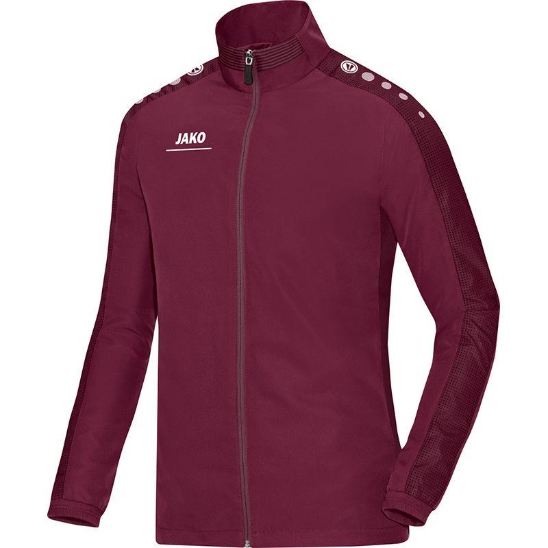 Koop hier het bordeaux JAKO Striker vrijetijds trainingsjack. Dit jack doet zijn naam eer aan en is de perfecte top om aan te vallen en je in de kijker te spelen. Dit is het ideale jack om voor of na het sporten te dragen. Het jack is geheel bordeaux en bevat aan de zijkanten twee zakken met ritsen. Verder wordt dit JAKO trainingsjack gekenmerkt door de hoge hals met een doorlopende rits. Over de schouders en mouwen bevinden zich de trademark tekens van JAKO en op de rechter borst prijkt het logo van het merk. De mouwen bevatten bovendien een contrasterende strip met sublimatieprint. Dit beklemtoont de sportieve look van de Striker lijn. Dit jack is uitgerust met ventilatie-openingen voor de optimale verkoeling. De mouwen worden afgesloten door een elastische binding en het jack bevat een mesh binnenvoering, voor het optimale gevoel.