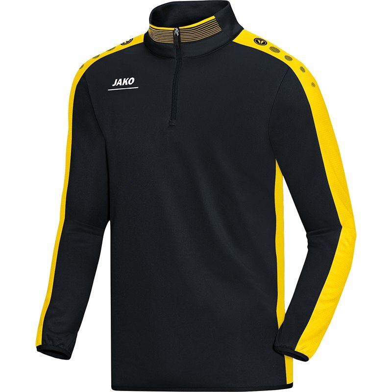 Koop hier de zwart/gele JAKO Striker zip training top. Deze training sweater doet zijn naam eer aan en is de perfecte top om aan te vallen en je in de kijker te spelen. Deze training top bevat een hoge hals met een rits tot de borst en ter hoogte van de rechter borst bevindt zich het logo van JAKO. De mouwen bevatten bovendien een contrasterende strip met sublimatieprint. Dit beklemtoont de sportieve look van de Striker lijn. Verder bevinden de trademark tekens van JAKO zich op de schouders en mouwen. De mouwen en de onderkant van de training worden afgesloten door een elastisch boord. Dit is de perfecte training top om met je (zaal)voetbalelftal of bedrijf in te voetballen of andere sporten in te beoefenenen. Deze training top bestaat voor 100% uit polyester.