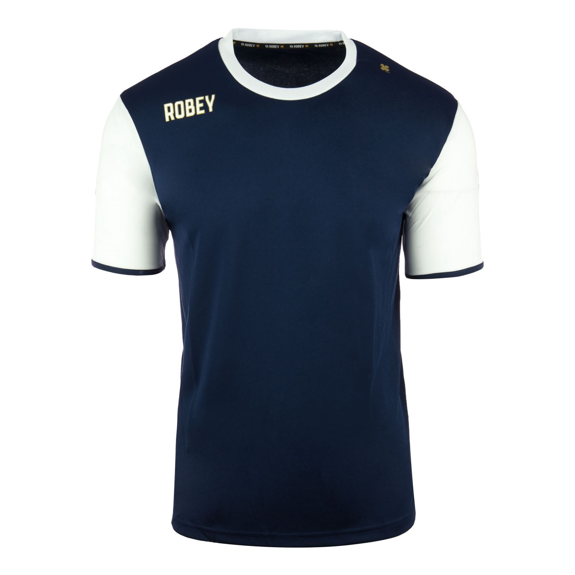 Koop hier het navy blauwe Robey Icon teamwear shirt. Dit Icon trainingsshirt is gebaseerd op legendarische voetbalshirts uit de vorige eeuw. Dit polyester voetbalshirt is overwegend navy blauw en bevat een ronde hals. De mouwen zijn wit met aan de onderkant een navy blauwe bies. De rechter borst bevat de naam van het merk Robey en op de mouwen is het logo van het Rotterdamse sportmerk te vinden. Op de linker schouder prijkt het klavertje vier in het goud. Dit is het ideale shirt om met je (zaal)voetbalelftal of bedrijf in te voetballen of trainen. Dit shirt bestaat voor 100% uit polyester en is uitgerust met de BeyDry technologie, die zorgt voor een koel en droog lichaam tijdens het sporten. Speciaal behandelde stoffen met een hoog ventilerend vermogen transporteren vocht snel naar de oppervlakte van de stof, waarna het snel verdampt. BeyDry creëert zo de ideale omstandigheden voor optimale prestaties.