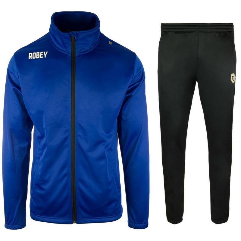 Koop hier het blauwe Robey Premier trainingspak voor kinderen. Dit KIDS pak bestaat uit een trainingsjack en een strakke trainingsbroek. Het trainingsjack bevat een rits tot de onderkant en ter hoogte van de rechter borst bevindt zich het logo van Robey. Op de linker schouder prijkt het klavertje vier. Dit trainingsjack is aan de binnenkant geborsteld voor extra warmte, heeft steekzakken met ritssluiting en een verstelbaar boord voor extra comfort. De trainingsbroek van dit pak is geheel zwart en is uitgerust met een elastische tailleband aan de bovenkant. Verder heeft de broek een getailleerde pasvorm en zijn de zijkanten uitgerust met twee zakken. Uiteraard mag het logo van Robey Sportswear niet ontbreken op de trainingsbroek. Dit is het perfecte trainingspak om met je elftal in te trainen of sporten. Dit trainingspak voor kinderenbestaat voor 100% uit polyester en is uitgerust met de BeyDry technologie, die zorgt voor een koel en droog lichaam tijdens het sporten. Speciaal behandelde stoffen met een hoog ventilerend vermogen transporteren vocht snel naar de oppervlakte van de stof, waarna het snel verdampt. BeyDry creëert zo de ideale omstandigheden voor optimale prestaties.