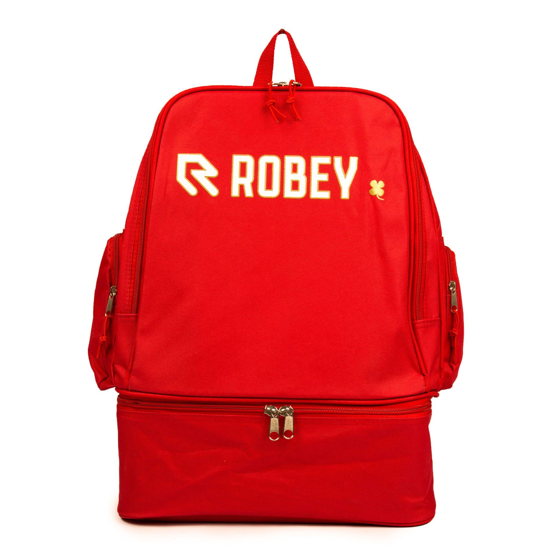 Koop hier de rode Robey Sportswear rugzak. Deze tas is gemaakt van een stijlvast synthetisch materiaal (polyester) en heeft verschillende opbergvakken. De bovenkant van de tas bevat een groot vak met een rits en ook de zijkanten van deze sporttas zijn uitgerust met kleinere opbergvakken. De onderkant van de tas bevat ook een vak met rits, waarin je bijvoorbeeld handig je sportschoenen of sneakers op kan bergen. Deze tas heeft een afmeting van 35 bij 24 bij 48 cm. Uiteraard prijken ook het logo van Robey met het klavertje vier op deze rugtas.