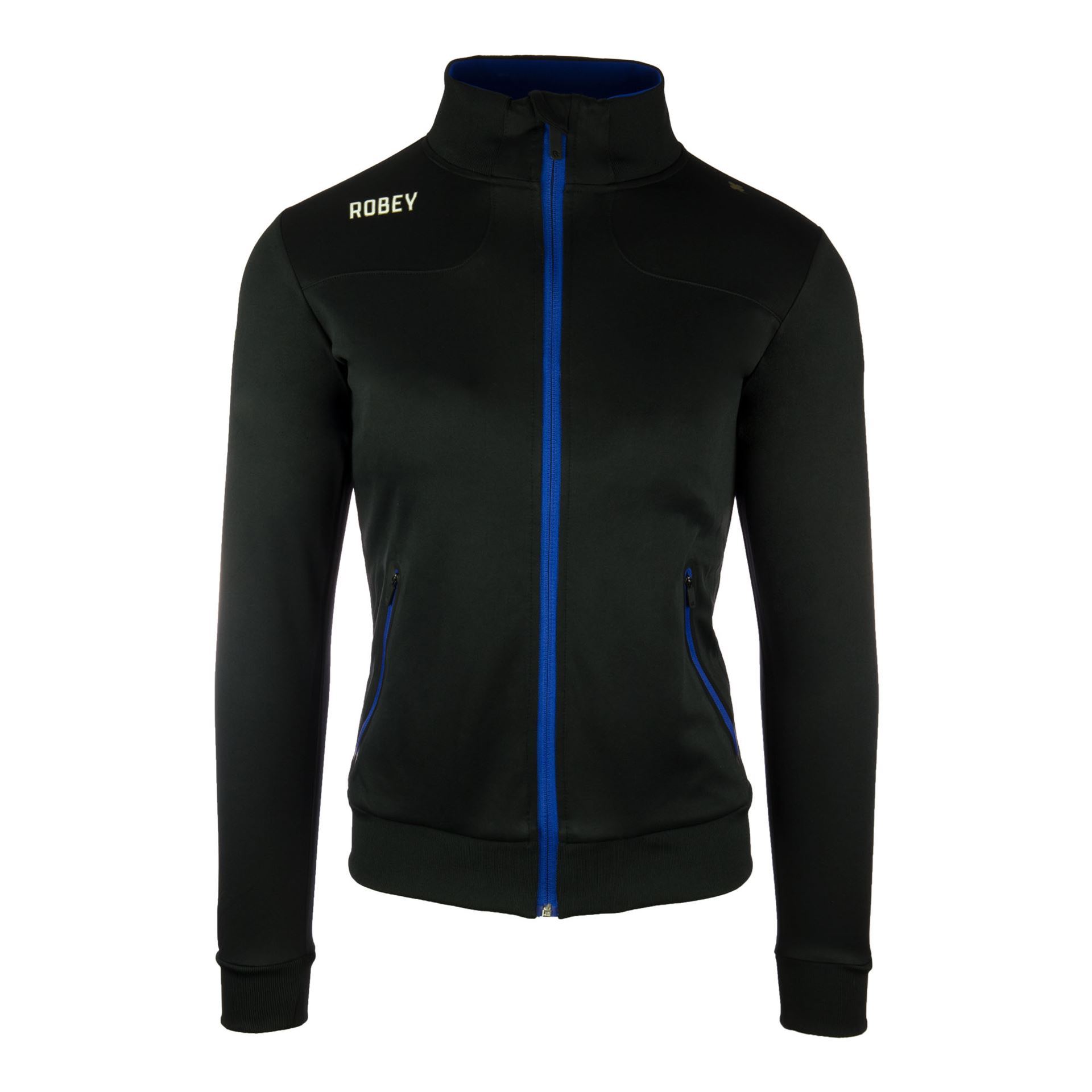 Koop hier het zwarte Robey Striker trainingsjack voor dames/vrouwen. Het Striker jack van Robey Sportswear heeft een speciale fit of pasvorm voor dames. Dit is het perfecte jack om in te trainen, te sporten, maar ook om casual te dragen. Het jack is geheel zwart en bevat contrasterende accenten. Het jack bevat een hoge hals met een blauwe zip tot de onderkant. De zijkanten van het jack zijn uitgerust met zakken met ritsen in het blauw. Verder is de binnenkant van het jack geborsteld, wat zorgt voor extra warmte. Het Striker trainingsjack bevat aan de onderkant van het jack een elastische tailleband, voor extra comfort. De rechter borst van het jack bevat het logo van Robey en het logo staat ook op de mouwen. Op de linker schouder prijkt het klavertje vier. Dit dames trainingsjack bestaat voor 100% uit polyester.