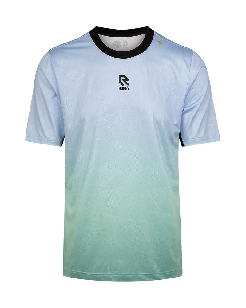 Ontdek de Robey Smash T-Shirt - Lichtblauw/Groen voor volwassenen, een performance shirt dat is ontwikkeld voor tennissers en padellers die het maximale uit hun spel willen halen. Dit sportieve shirt combineert comfort, functionaliteit en een moderne uitstraling, zodat jij met vertrouwen de baan op stapt. Dit shirt is een combinatie van lichtblauw en mintgroen. Het shirt bevat een gradiënt effect, waarbij deze kleuren in elkaar overlopen. Op het midden van het shirt prijkt het logo van Robey en de linkerschouder is uitgerust met een klavertje vier, voor wat extra geluk! In de nek op de achterkant van het shirt prijkt het logo van Robey Racket Club, het tennislabel van Robey!
